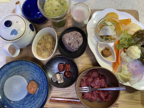 カブと白菜の麹漬け、味噌、スムージー、甘酒、ミキ、納豆、果物(柿とりんご)、黒米入りおにぎり、黒糖、なつめ、番茶